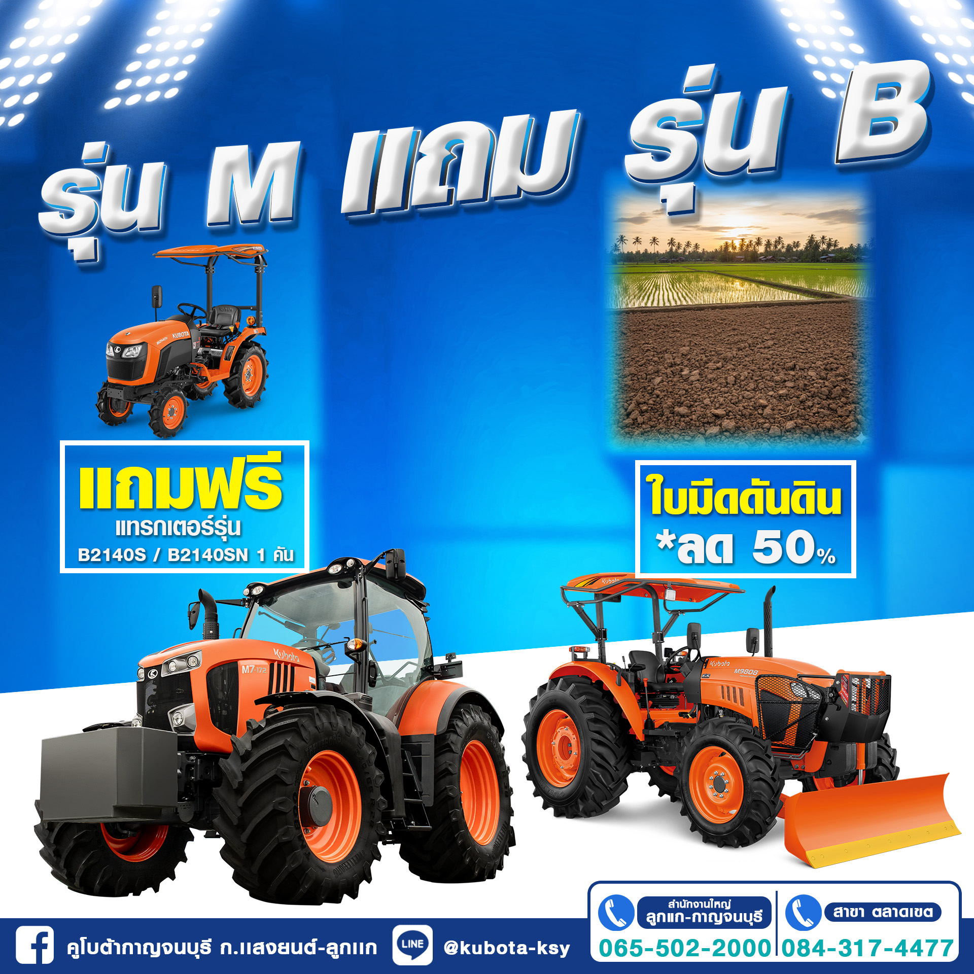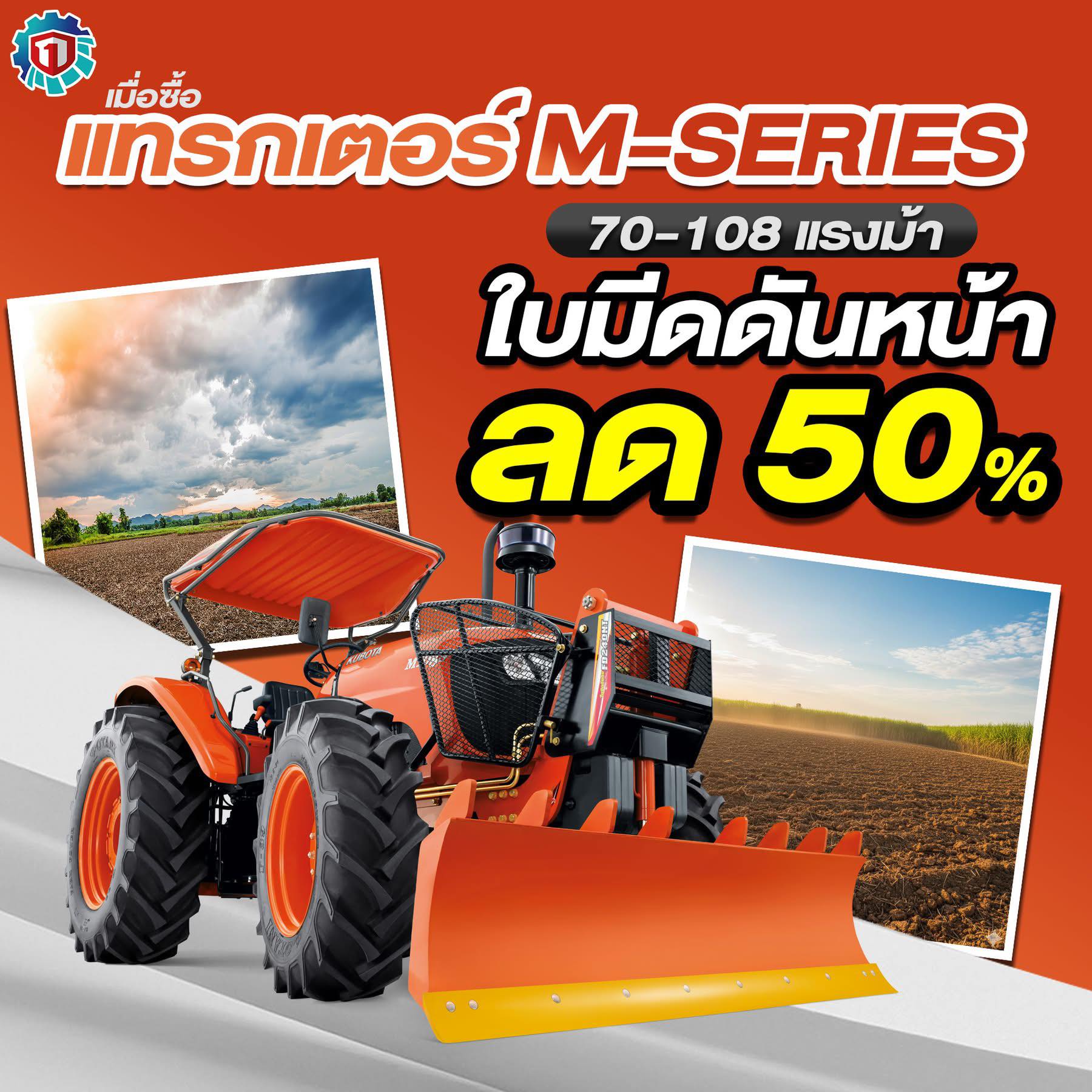 🚜 M-Series ใบมีดดันดิน ลด 50% เมื่อซื้อรุ่นที่ร่วมรายการ (M7040 / M7508 /M8808 / M9808 / M108S) ซื้อ M135X / M7-172 👉 แถมฟรีแทรกเตอร์ B2140S / B2140SN อีก1 คัน 💚 พิเศษ! แคร์อุ่นใจ 5 ปี ฟรีทุกรุ่น ตรวจเช็กถึงบ้าน + ฟรี/ลดค่าอะไหล่ คุ้มยาวถึง 5 ปี