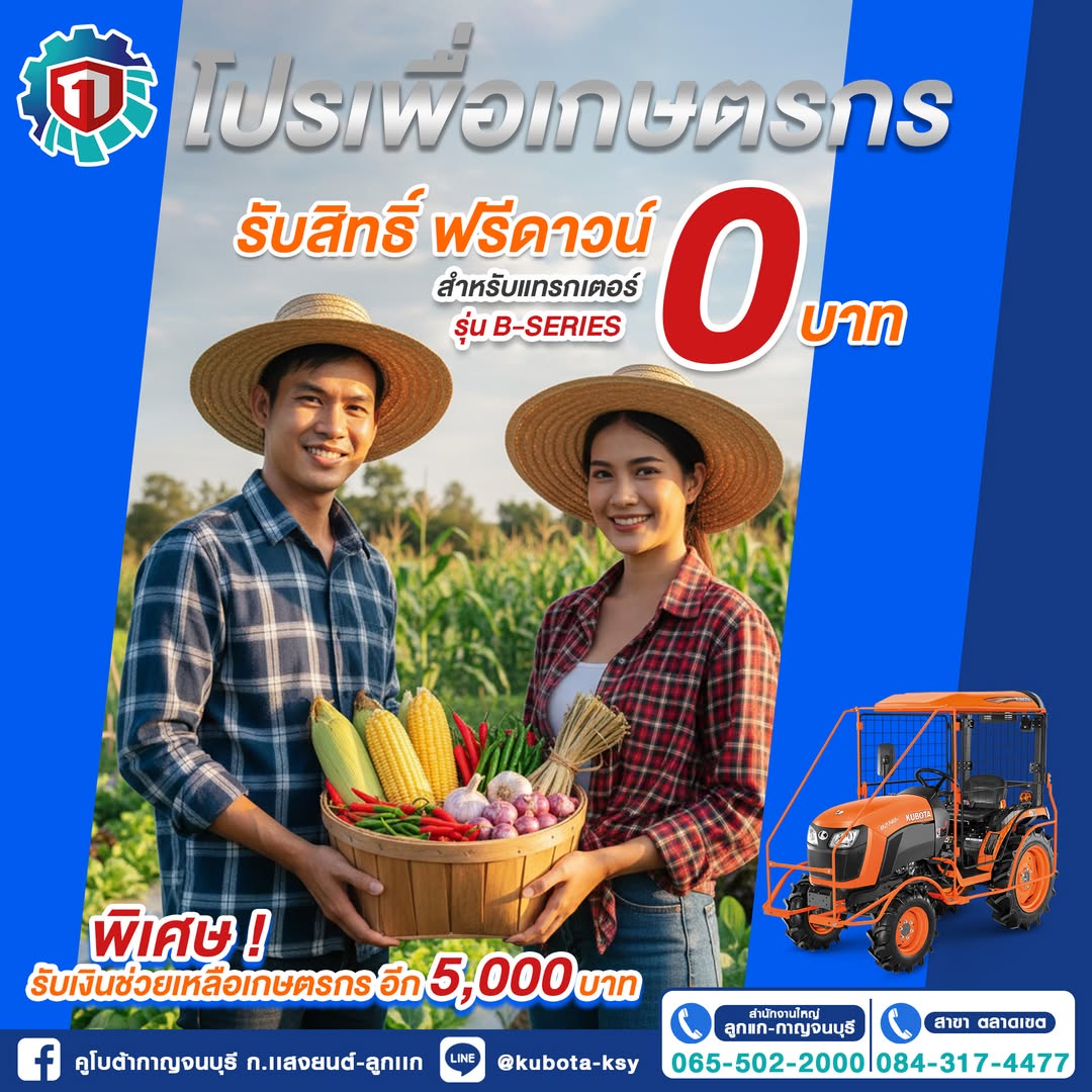 📌 เฉพาะเดือนมกราคม 2569 🎉 คูโบต้ามอบของขวัญปีใหม่ ให้เกษตรกรไทย ช่วยเหลือค่าผลผลิต ตันละ 500 บาท สูงสุด 10 ตัน รวมมูลค่า 5,000 บาท